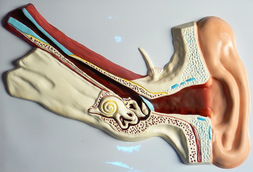 Модель изготовлена из пластмассы путем вакуумного формования. На барельефной модели можно рассмотреть следующие детали внешнего и внутреннего строения человеческого уха: