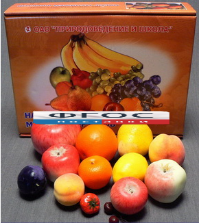 Список муляжей: 1. Яблоко «Апорт» 2. Яблоко «Кальвиль анисовый» 3. Яблоко «Ранет» 4. Мандарин 5. Вишня 6. Клубника 7. Лимон 8. Слива 9. Персик 10. Абрикос 11. Груша 12. Яблоко «Пепин шафранный» 13.Апельсин